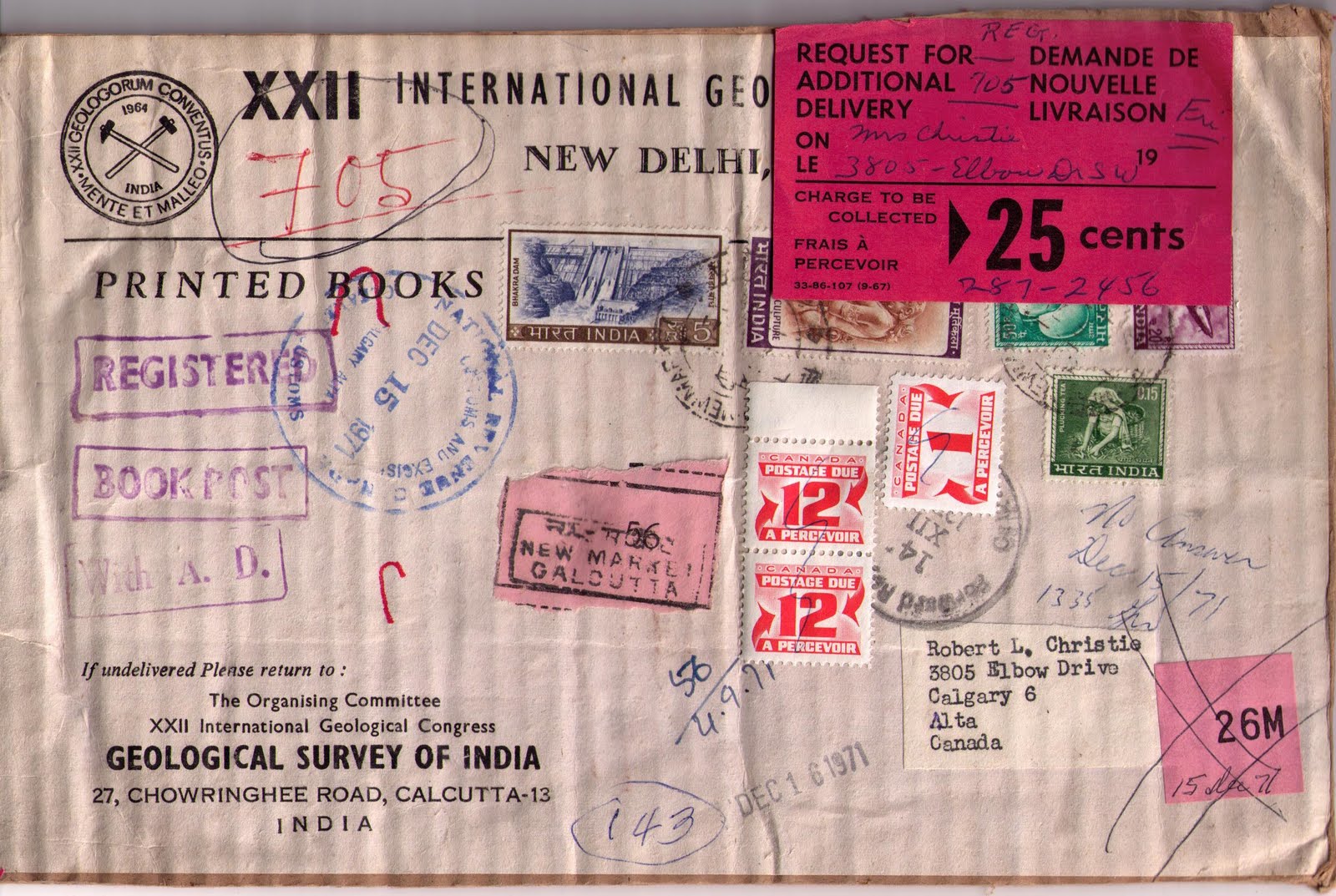 Calcutta to Calgary, cancellation date indistinct (4/9/71 written on parcel)