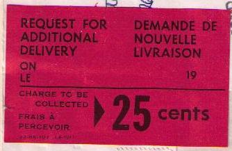 A Delivery Notice card was left with an addressee when mail articles could not be delivered because there was no answer at the door when delivery was attempted. The Notice Card advised that the article would be held for a specified number of days only. The addressee could pick up the article at the Post Office listed on the card or could telephone ( number provided on the card) for the item to be delivered. The Additional Delivery service fee was 25c per item.