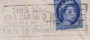 Railway Post Offices on trains such as those from Northern Ontario to Toronto had letter boxes within which mail could be deposited. A letter could be mailed directly at the train station rather than at the post office to expedite its conveyance. No extra fee was charged for this service. The letters were cancelled on arrival in Toronto receiving the "THIS MAIL WAS CARRIED BY TRAVELLING LETTER BOX TO TORONTO":