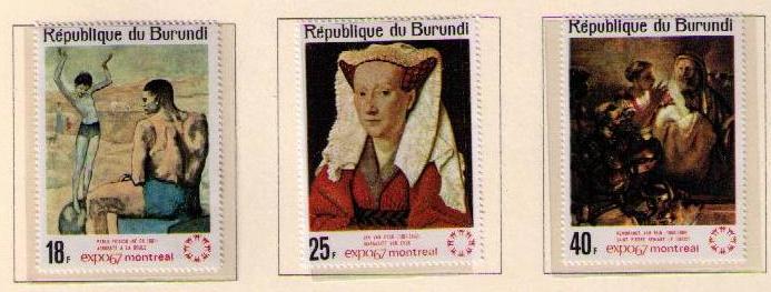 Burundi issued six stamps and one souvenir sheet (perforate and imperforate) showing paintings that were exhibited at Expo 67.