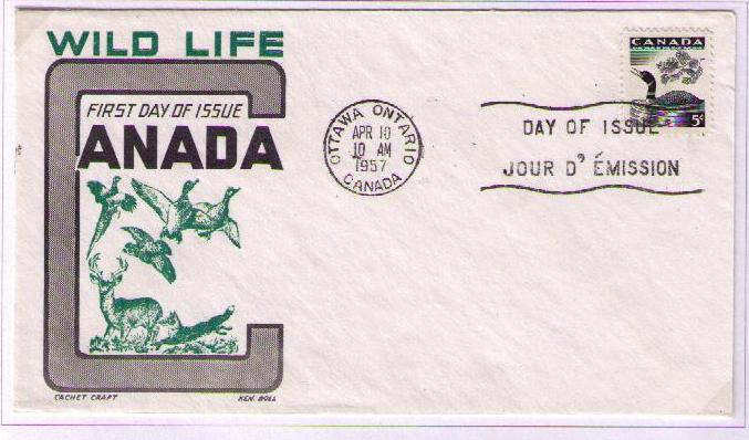 The fifth and final Wildlife series issue, a single 5 cent stamp featuring the Loon, was released on April 10, 1957 coinciding with National Wildlife Week. The stamp was designed by Laurence Hyde of Montreal.