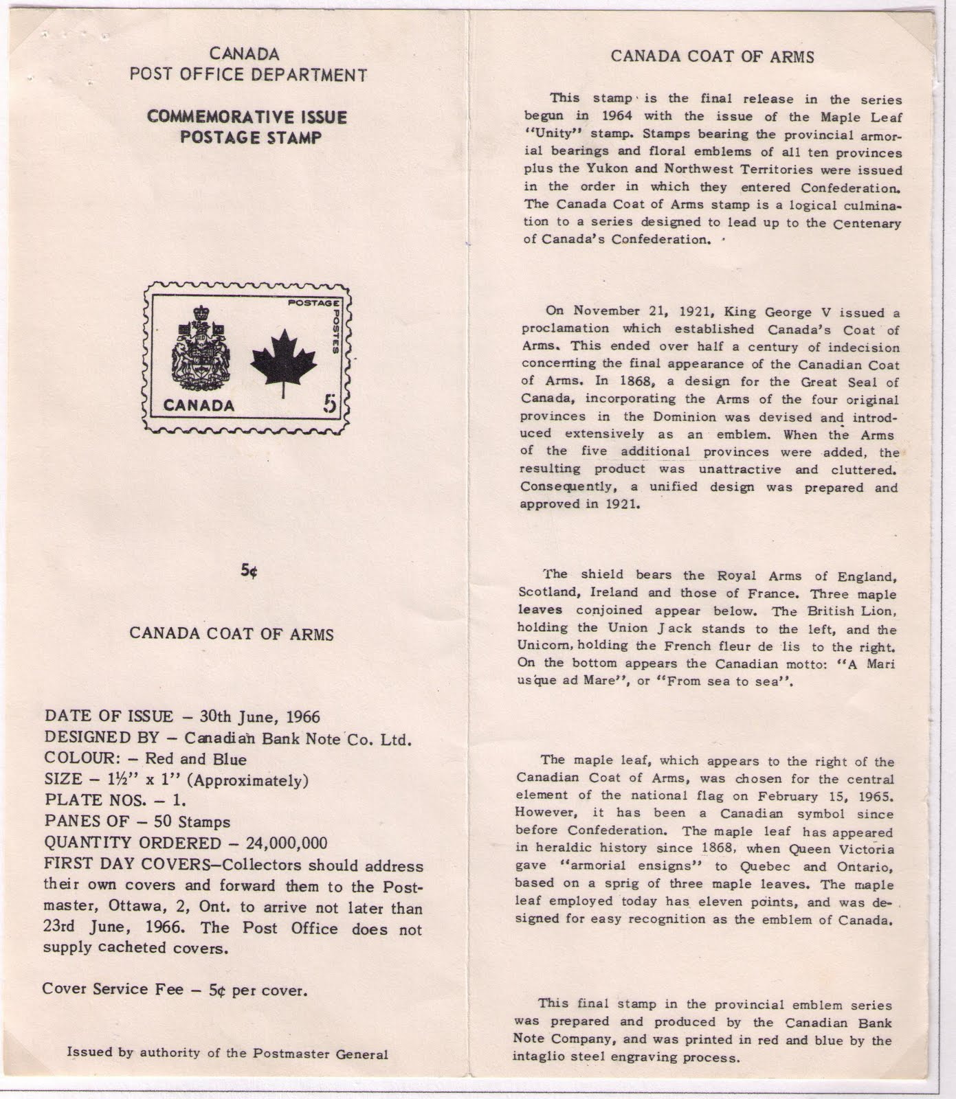 The Canada Coat of Arms stamp completing the Floral Emblem series was issued on June 30, 1966.