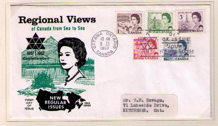 The Centennial definitive series issued on February 8, 1967 consisted of twelve stamps. The five lower denomination stamps featured the image of Queen Elizabeth combined with a regional view of Canada. The five geographical regions of Canada, the North, the Pacific Coast, the Prairies, Central Canada and the Atlantic Coast were represented in succession from the one cent to the five cent denomination. The Rolland Paper Company Limited published a souvenir booklet entitled "Canada's Centennial Stamps" with illustrations of each stamp.