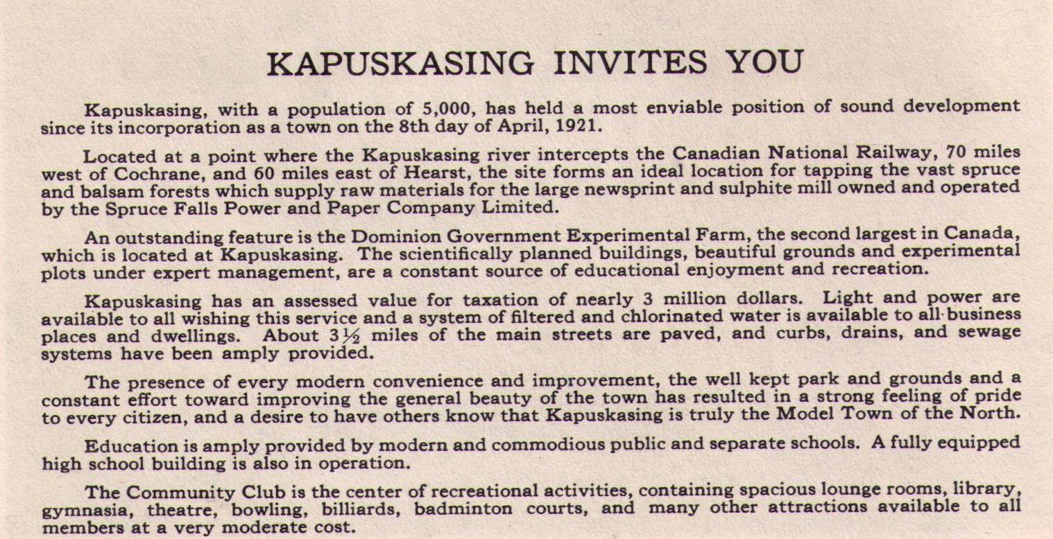 In the late 1930s or early 1940s, the Kapuskasing Chamber of Commerce sponsored the publication of a "Souvenir Folder" to promote the Model Town of the North. The folder consisted of 10 panels on a 90 cm piece of paper, accordion folded. Both sides of the strip had pictures printed on each panel, with the exception of two text panels. The strip was sandwiched between thick paper covers creating a postcard folder.