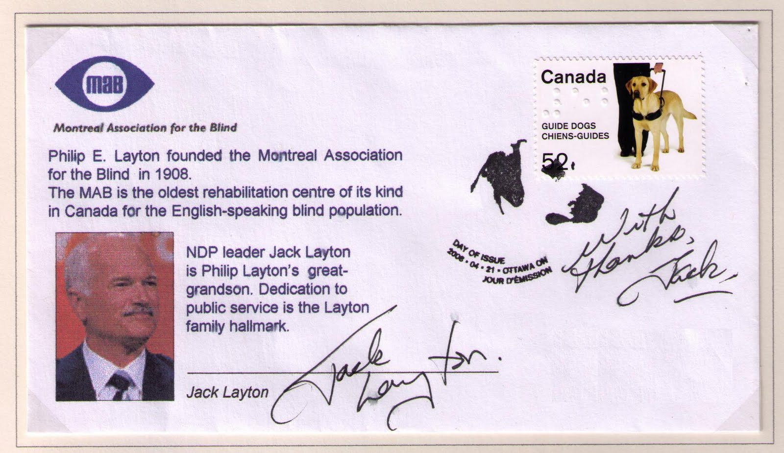 Canada Post issued a commemorative Guide Dog stamp on April 21, 2008, as well as a commemorative envelope celebrating the centenary of the Montreal Association for the Blind ("MAB") founded by NDP leader Jack Layton's great grandfather Philip Layton.